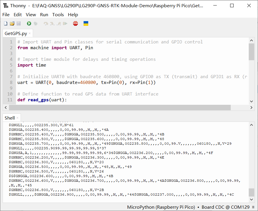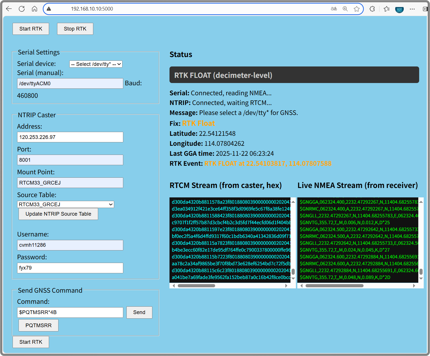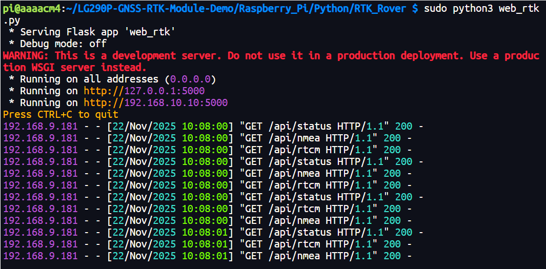 pip3 install flask pyserial wget https://files.waveshare.com/wiki/LG290P-GNSS-RTK-Module/Demo/LG290P-GNSS-RTK-Module-Demo.zip sudo unzip LG290P-GNSS-RTK-Module-Demo.zip cd LG290P-GNSS-RTK-Module-Demo/Raspberry_Pi/Python/RTK_Rover/ sudo python3 web_rtk.py