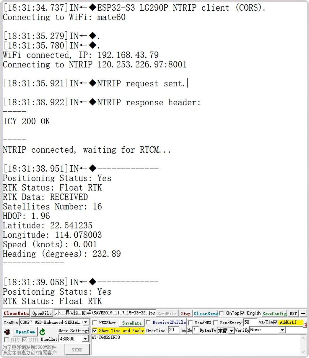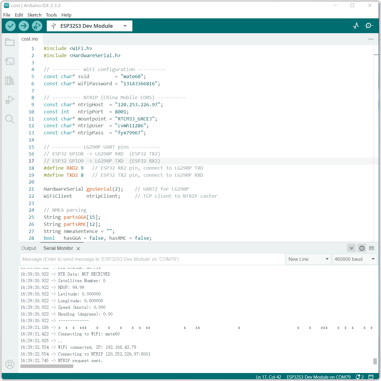 //给ESP连接WiFi,让能够获取基站服务器数据 const char* ssid = "mate60"; //热点SSID const char* wifiPassword = "131433"; //对应密码 // ---------- NTRIP (这里是中海达CORS为例,对应修改以下参数) ---------- const char* ntripHost = "120.253.226.97"; const int ntripPort = 8001; const char* mountpoint = "RTCM33_GRCEJ"; const char* ntripUser = "cvmh11286"; const char* ntripPass = "fyxxx";