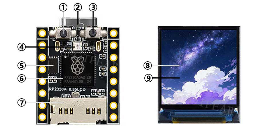 树莓派Pico 2 RP2350 0.85寸LCD迷你显示屏开发板RGB灯SD槽陀螺仪