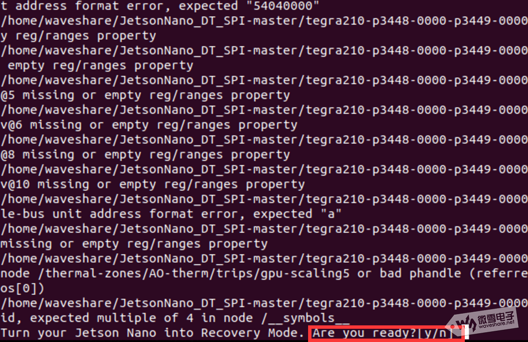 下载根文件系统和R32包后,脚本自动替换设备树文件并写入根文件系统,接着界面提示Nano是否进入Recovery模式 ![]() 此时应将跳帽置Recovery引脚,J48引脚,MicroUSB接入PC,使用DC头供电 ![]() 在终端输入y确认