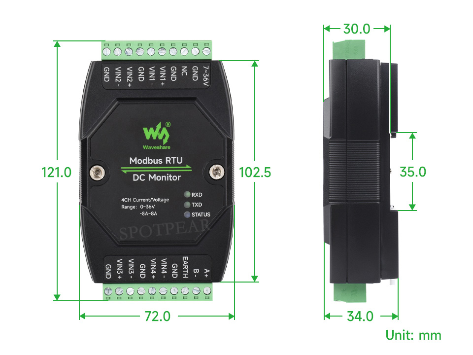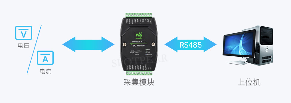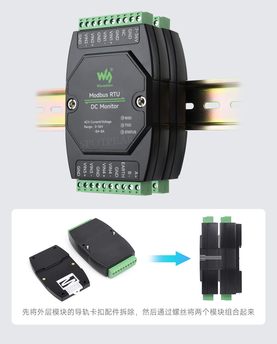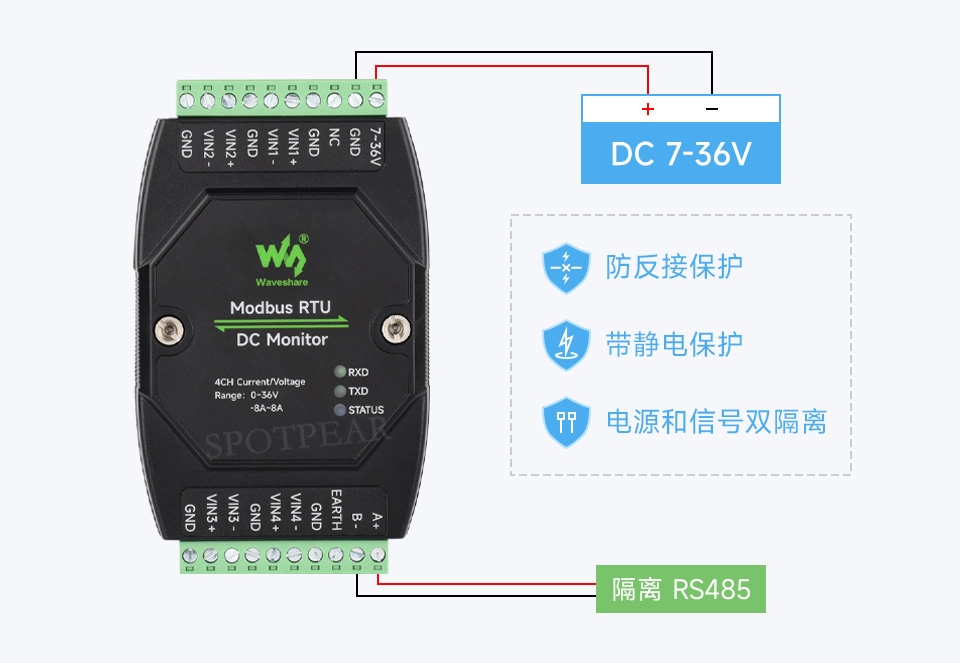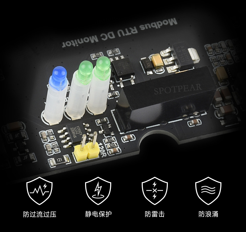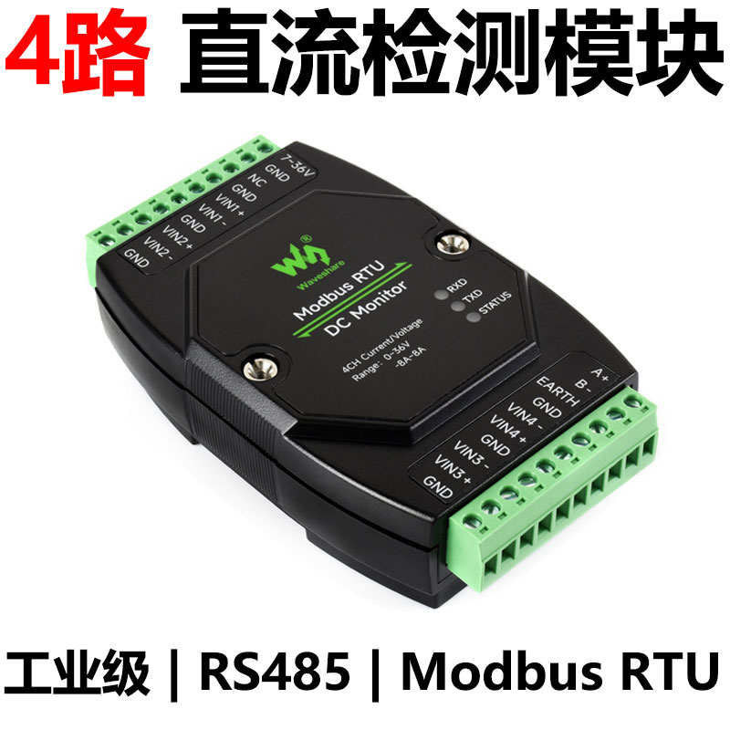 本产品是一款工业标准直流检测模块,支持 4 路检测。采用 Modbus RTU 协议,内置电源隔离、光耦隔离、自恢复保险丝和 TVS 等保护电路。