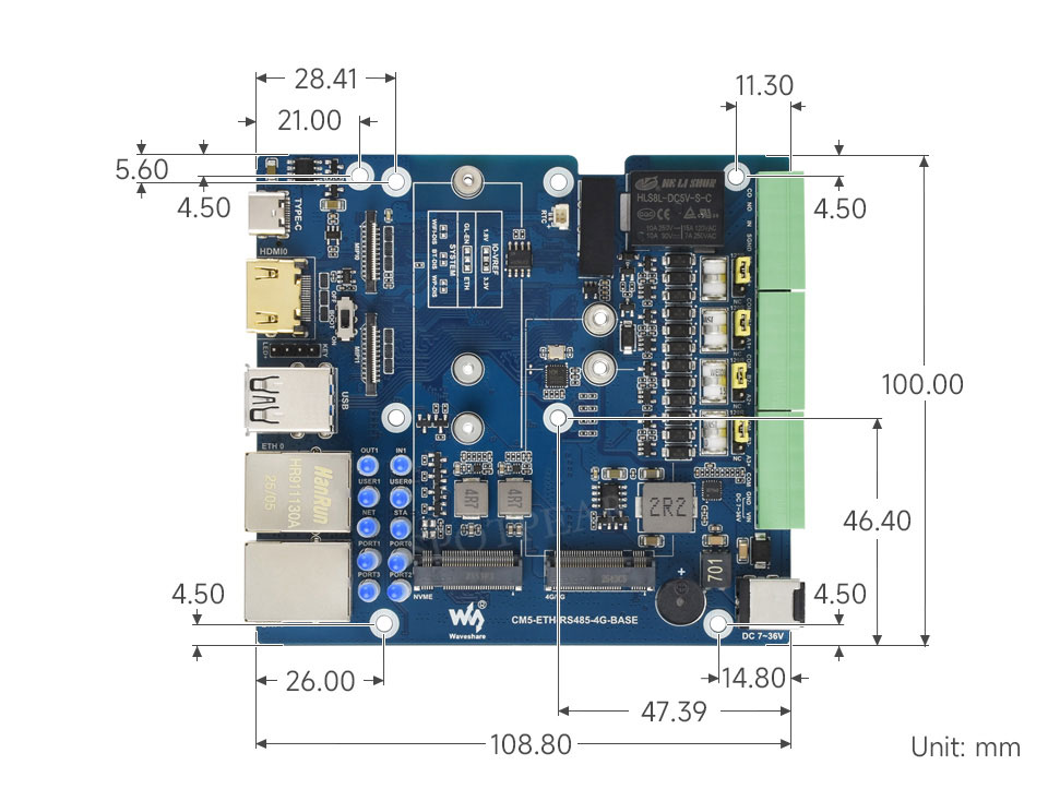 | 电源输入 | 7V ~ 36V 宽电压 (接线端子 + 圆孔) 或 5V 5A (Type-C) |