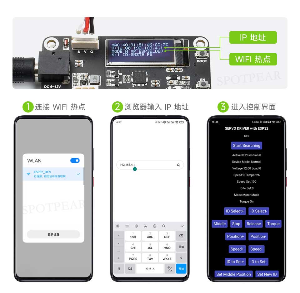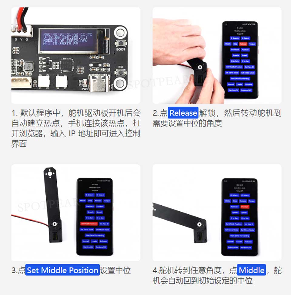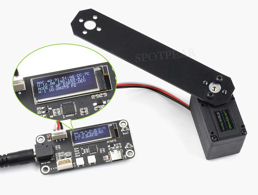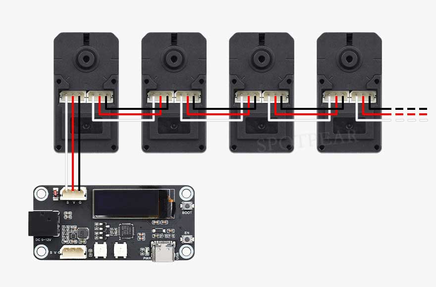 一路 UART 可以控制 253 个总线舵机,但是由于舵机功率较大,当使用过多舵机时需要考虑供电方案能否满足要求。本产品不含图中的 舵机主控板,如有需要,请另行购买