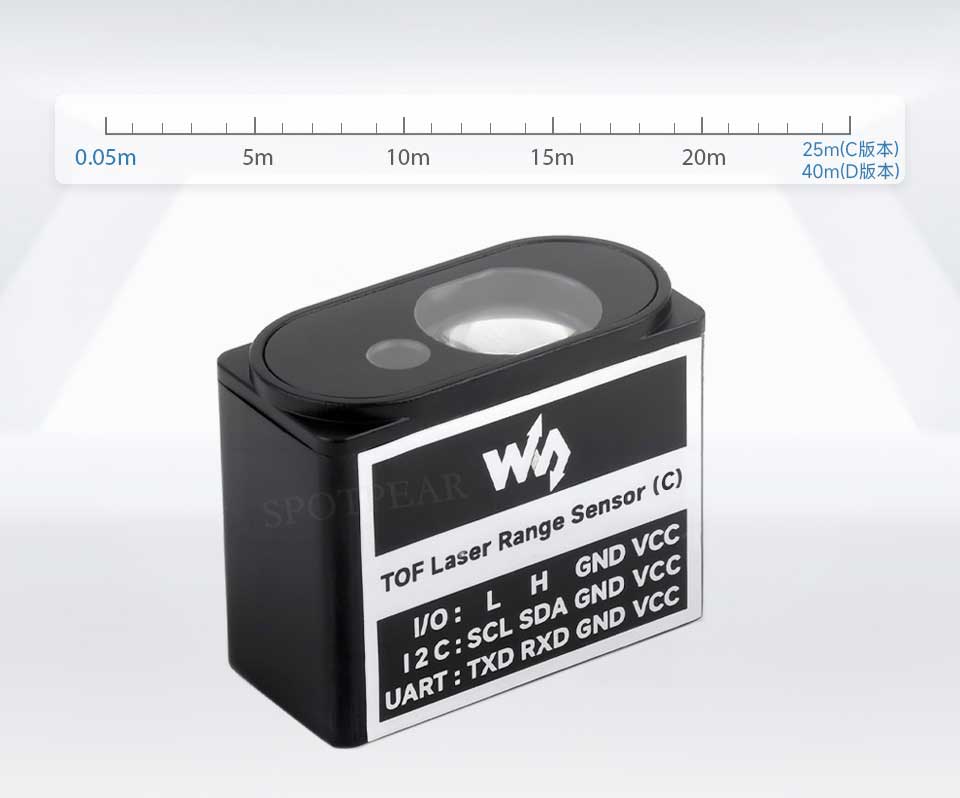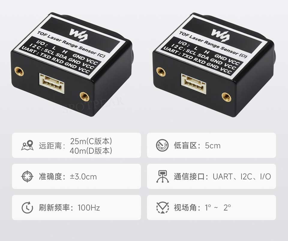 这是一款基于 TOF (飞行时间) 技术的激光测距传感器。内置控制器和测距算法,测距范围可达 25m / 40m (可选),精度高达 ±3cm。支持 UART 和 I2C 通信,具备超小的视场角 (FOV),使得测距范围更远,抗光干扰能力更强,室内外环境均适用,抗光干扰能力高达约 100K LUX 照度,可以作为测距工具进行距离检测,也可作为机器人避障/路线规划,还可用于天花板检测和料位测量等领域。