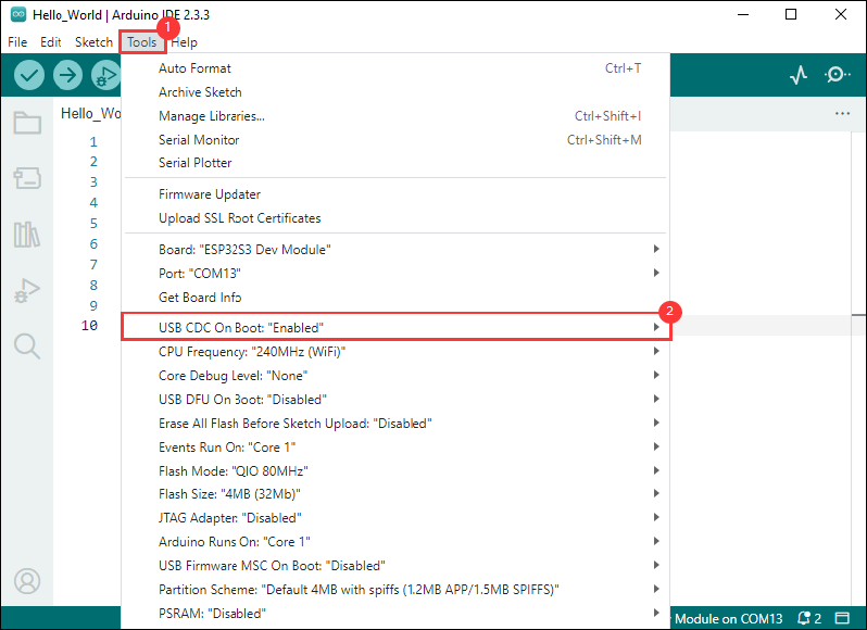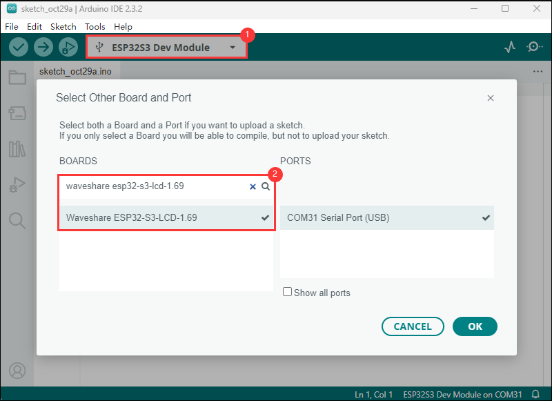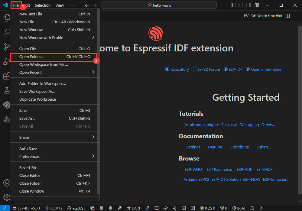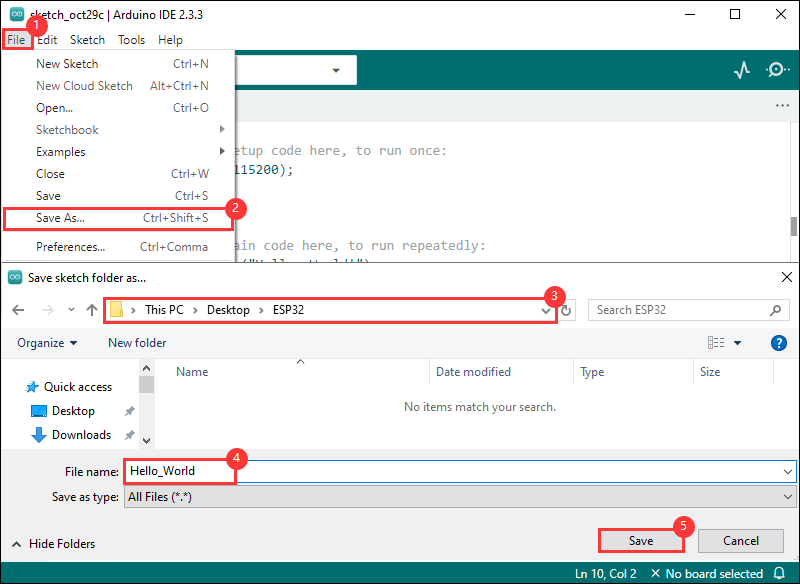 }File -> Save As...;在弹出的菜单选择保存工程路径,并输入工程名,如 Hello_World,点击保存①. 点击选择下拉框选项“Select Other Board and Port”;