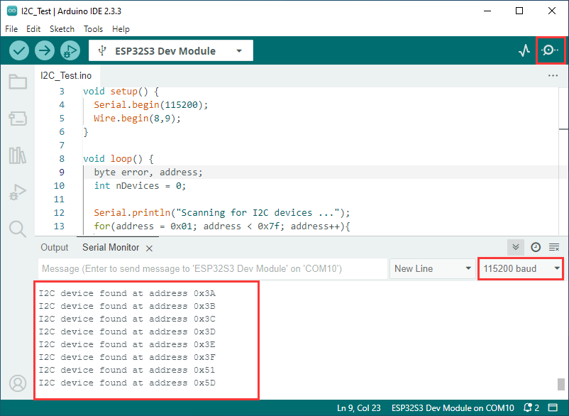 最后,如果没有找到任何 I2C 设备,打印相应的消息,并使用 delay(5000) 使程序暂停 5 秒后再次进行扫描。