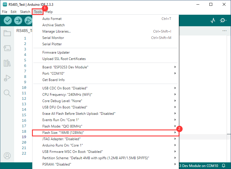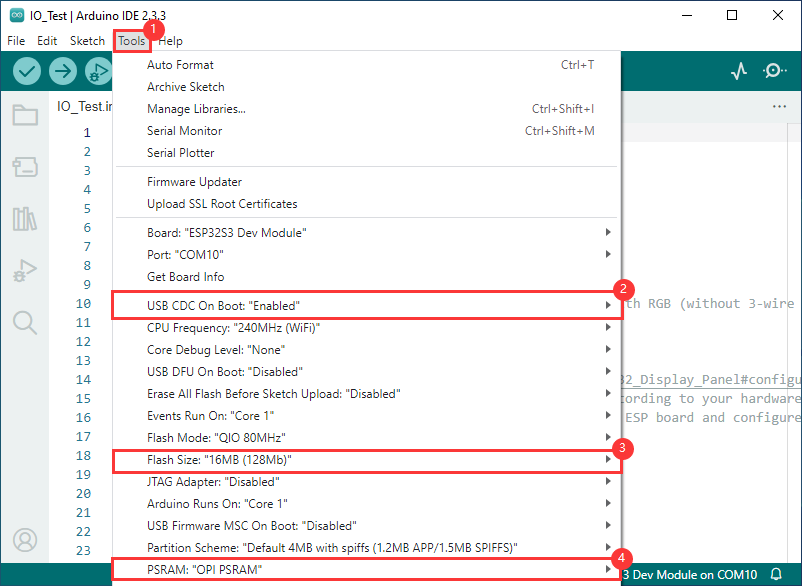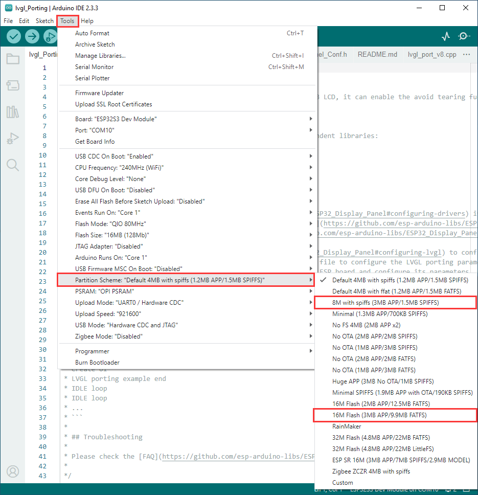 若烧录代码后,屏幕无反应,可查看是否有在Arduino IDE -> Tools正确配置:选择对应 Flash(16MB) 和使能 PSRAM(8MB OPI))