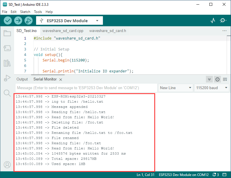 waveshare_sd_card_test() :这个函数用于测试 SD 卡的功能。首先打印已初始化的 SD 卡的信息。然后创建一个文件并写入数据,重命名该文件并读取重命名后的文件内容。接着格式化文件系统,检查文件在格式化后是否被删除。最后创建一个新文件并读取其内容,完成测试后卸载 SD 卡并释放 SPI 总线资源。