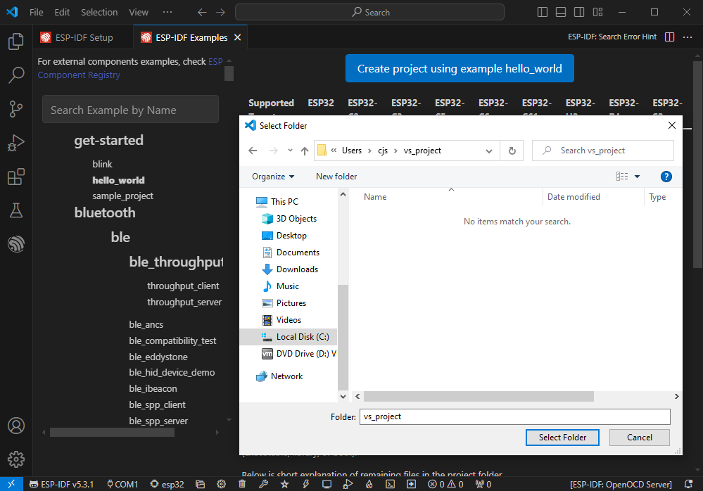 本章介绍 ESP-IDF 环境搭建,包括 Visual Studio、Espressif IDF插件的安装,程序编译下载及示例程序测试,帮助用户掌握开发板,便于二次开发。