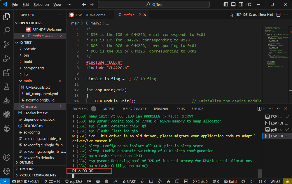 waveshare_io_test() :首先,它打印出 “Initialize IO expander” 表示开始初始化 IO 扩展器。接着创建一个 ESP_IOExpander_CH422G 实例来代表 IO 扩展器,初始化并开始其操作。然后将 OC 引脚设置为推挽输出模式,将 IO0 - IO7 引脚设置为输入模式。同时设置输出引脚 DO0 和 DO1 的初始状态为高电平。