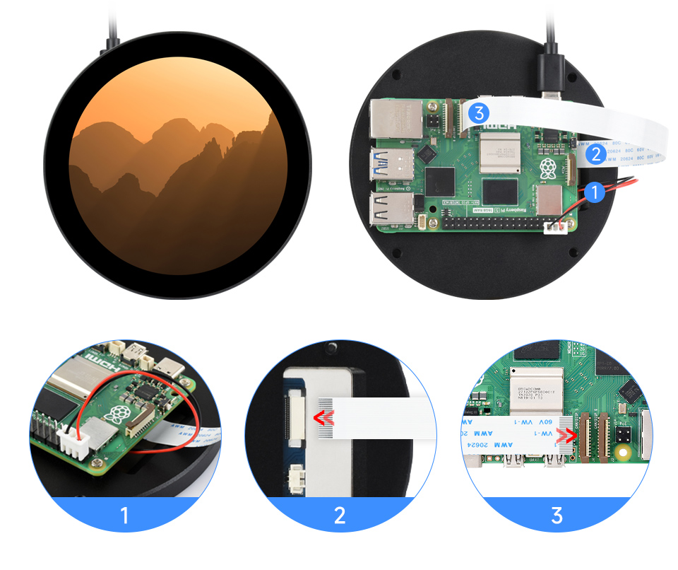注意:请确保 DSI 排线方向连接无误,并通过 GPIO 引脚提供 5V 电源。