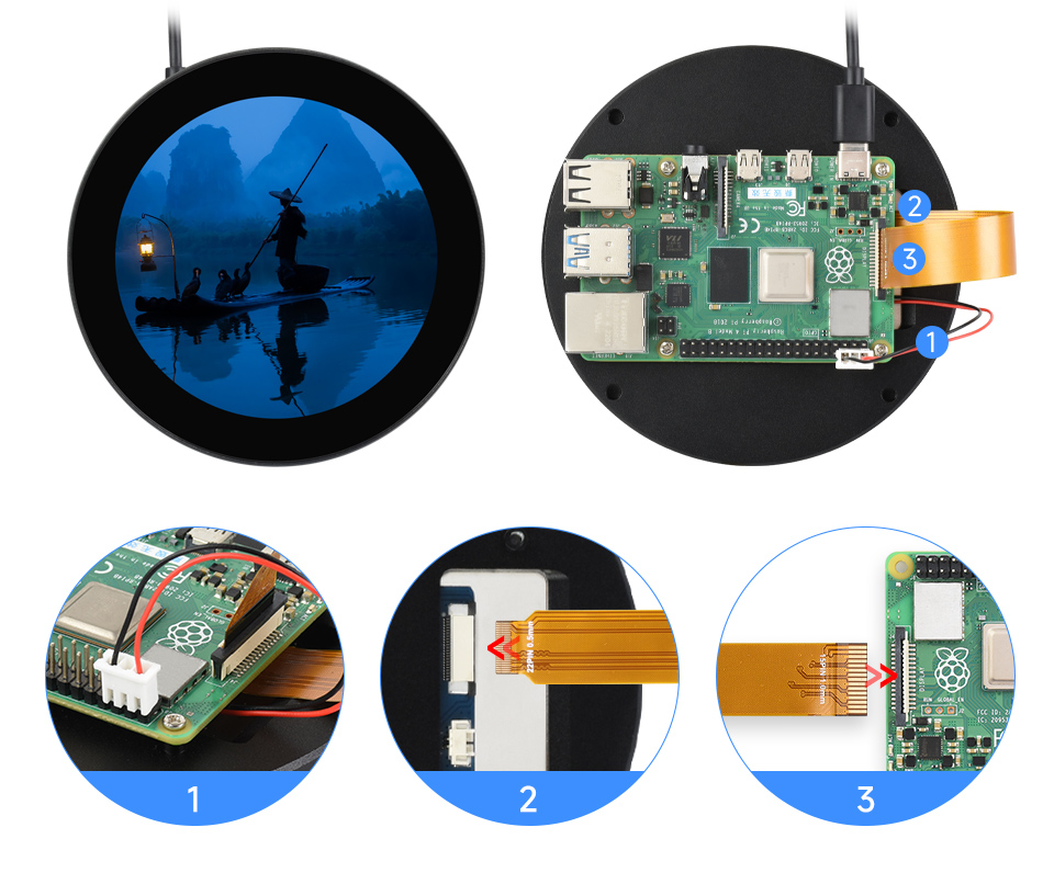 1.使用"DSI-Cable-12cm"排线,将显示屏的DSI接口连接到树莓派主板的15PIN DSI接口。 2.使用"GPIO 连接线",将显示屏的电源接口连接到树莓派主板的5V GND排针。
